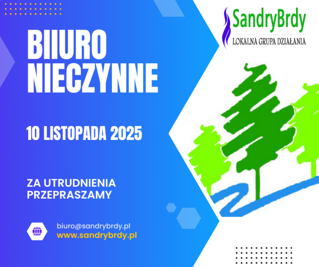Informujemy, że w dniu 10 listopada 2025 r., tj. poniedziałek, biuro LGD Sandry Brdy będzie nieczynne. Za utrudnienia przepraszamy!